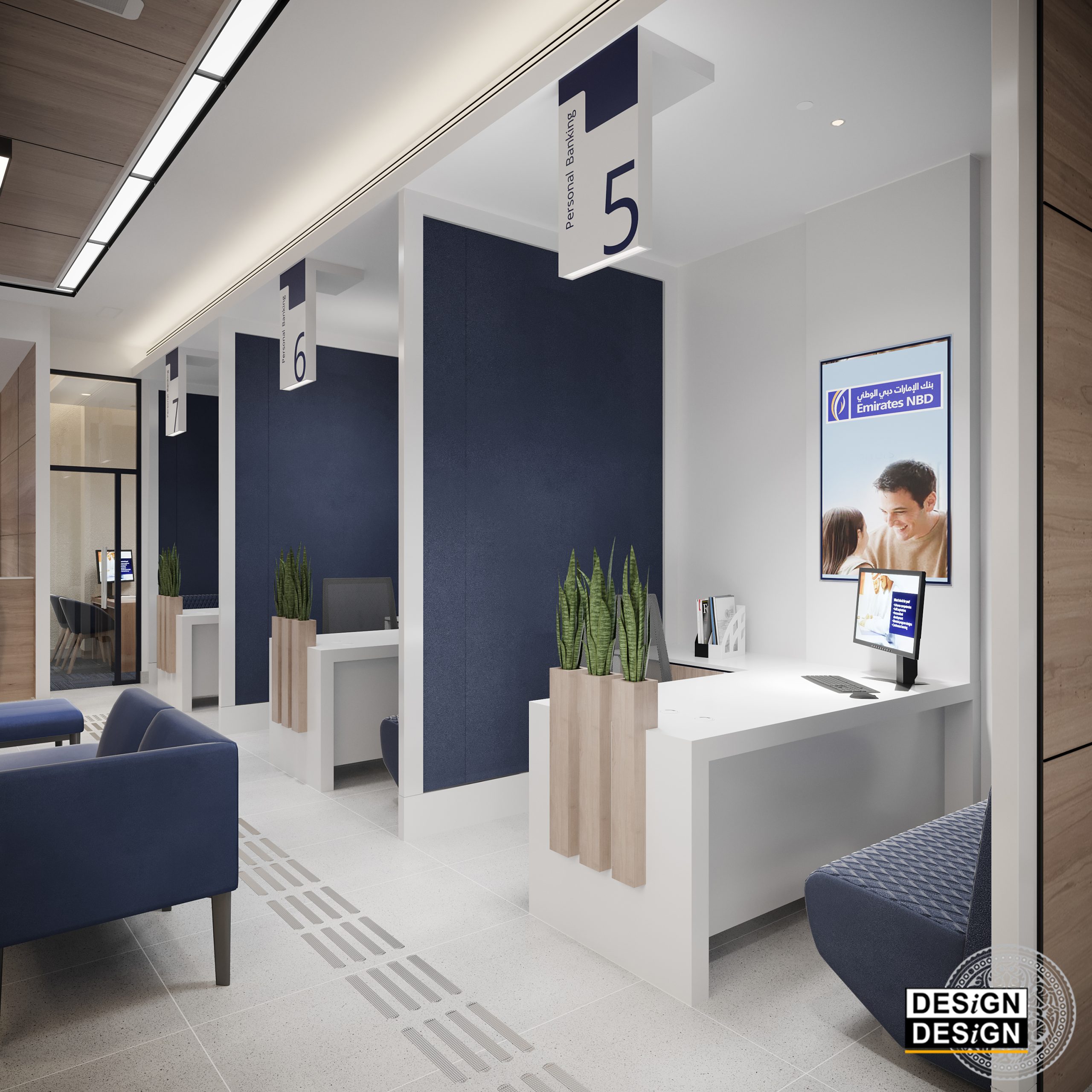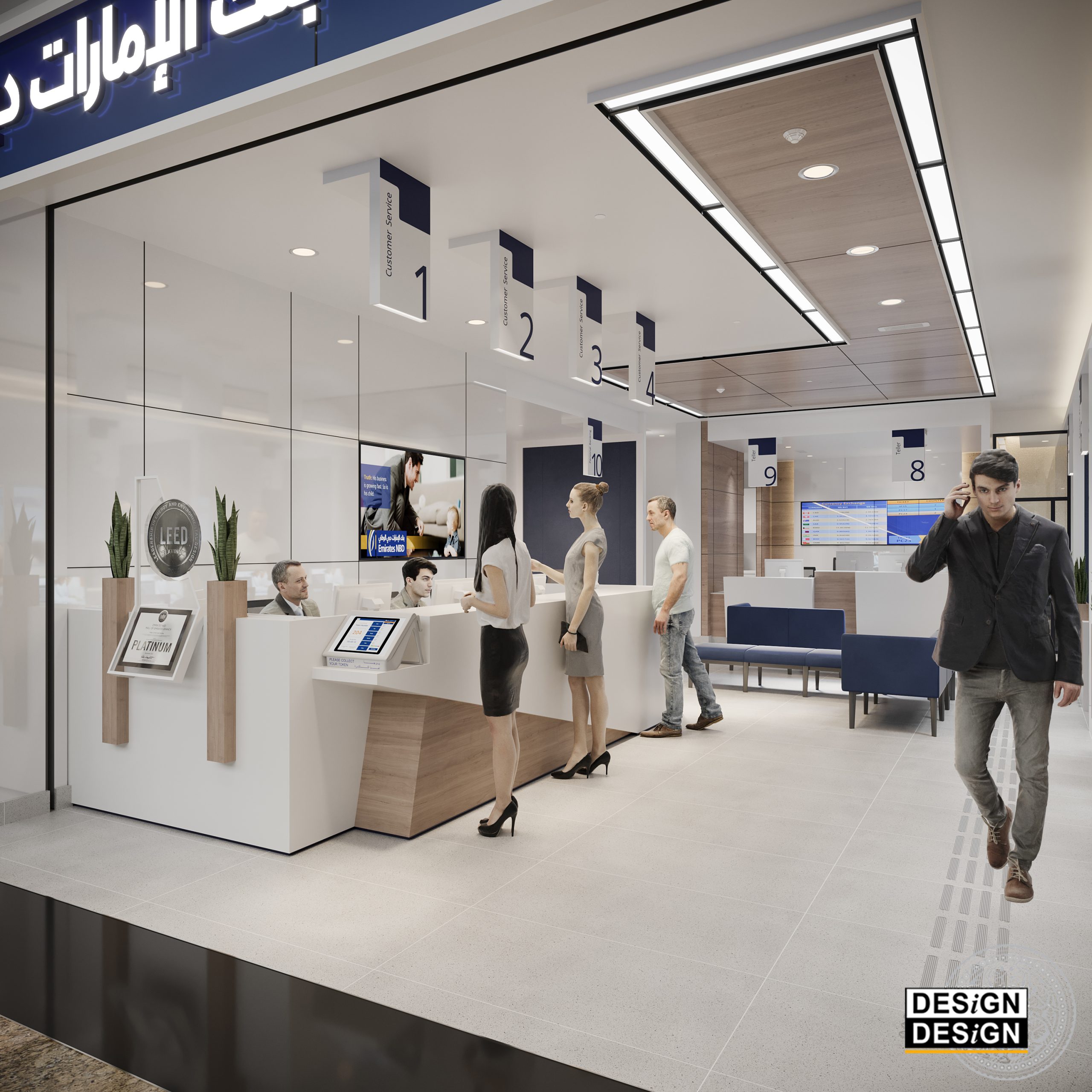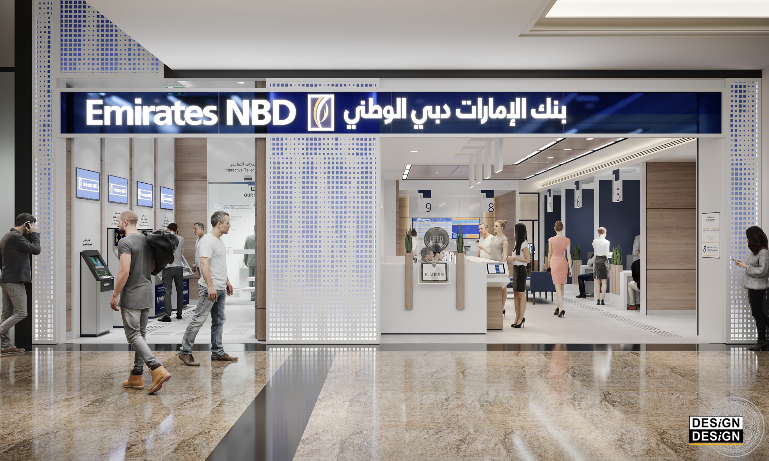 The project consists of developing the design concept of Emirates NBD typical retail branch. For this purpose, an eventful branch, located in the Mall of the Emirates in Dubai, was selected to serve as a prototype. The branch features modular work-cells carefully designed to accommodate specific operations. The general mood is minimal, cheerful and dynamic keeping an open circulation and easy access to branch visitors. The finishing materials are selected from sustainable recourses casting an authentic modern look to the branch interior. The prototype Emirates NBD retail branch is the first of its kind in the GCC and the second bank worldwide to successfully achieve the Platinum LEED certification.