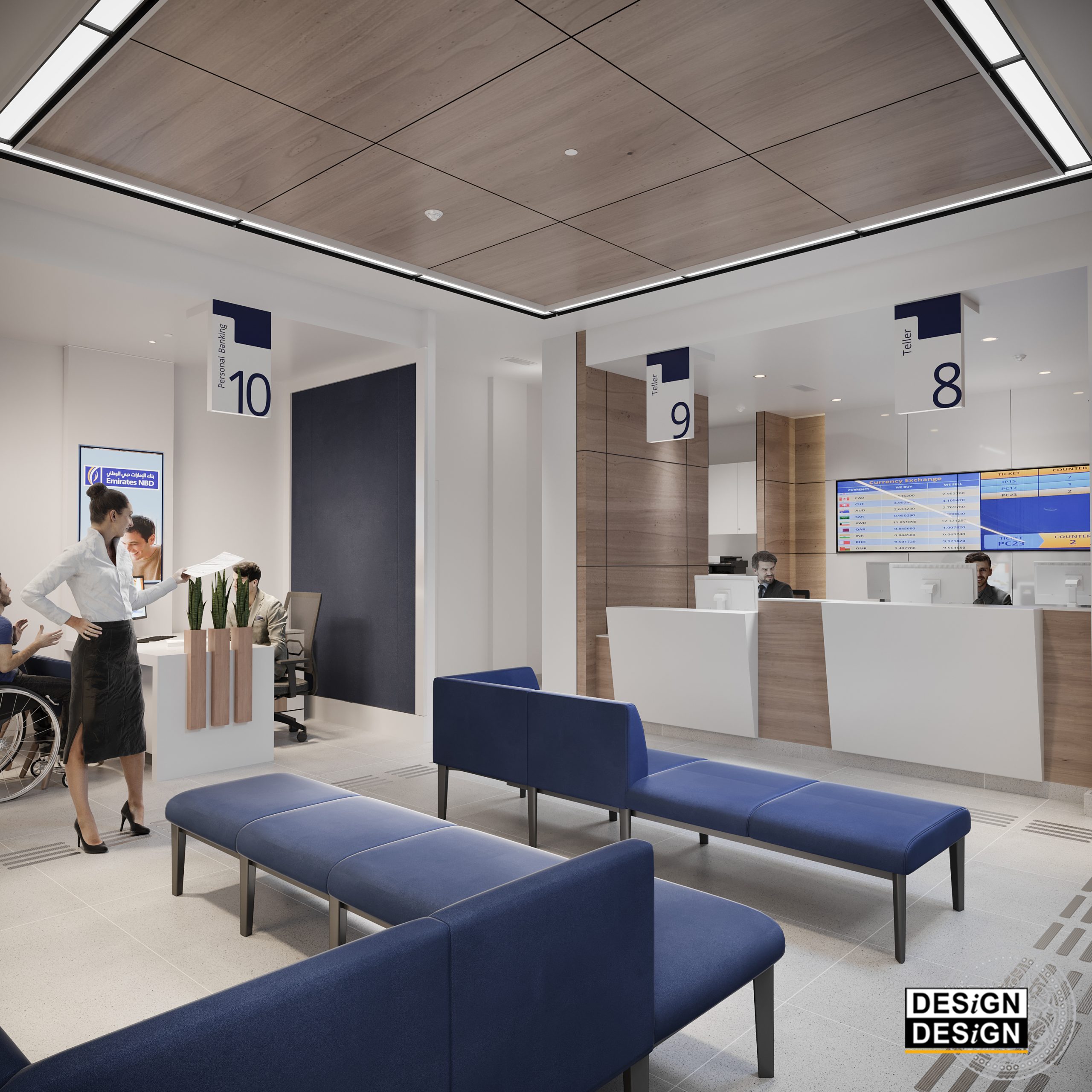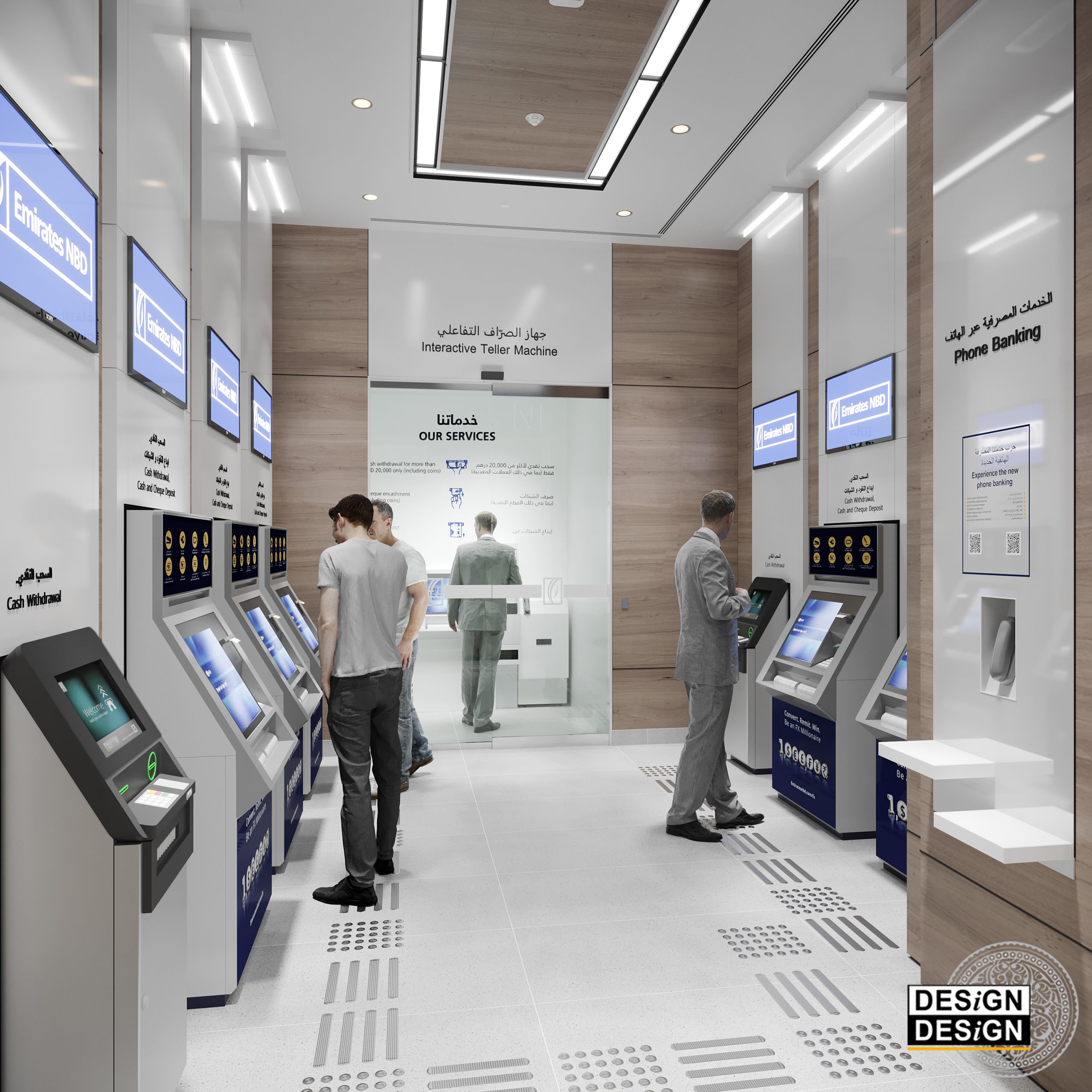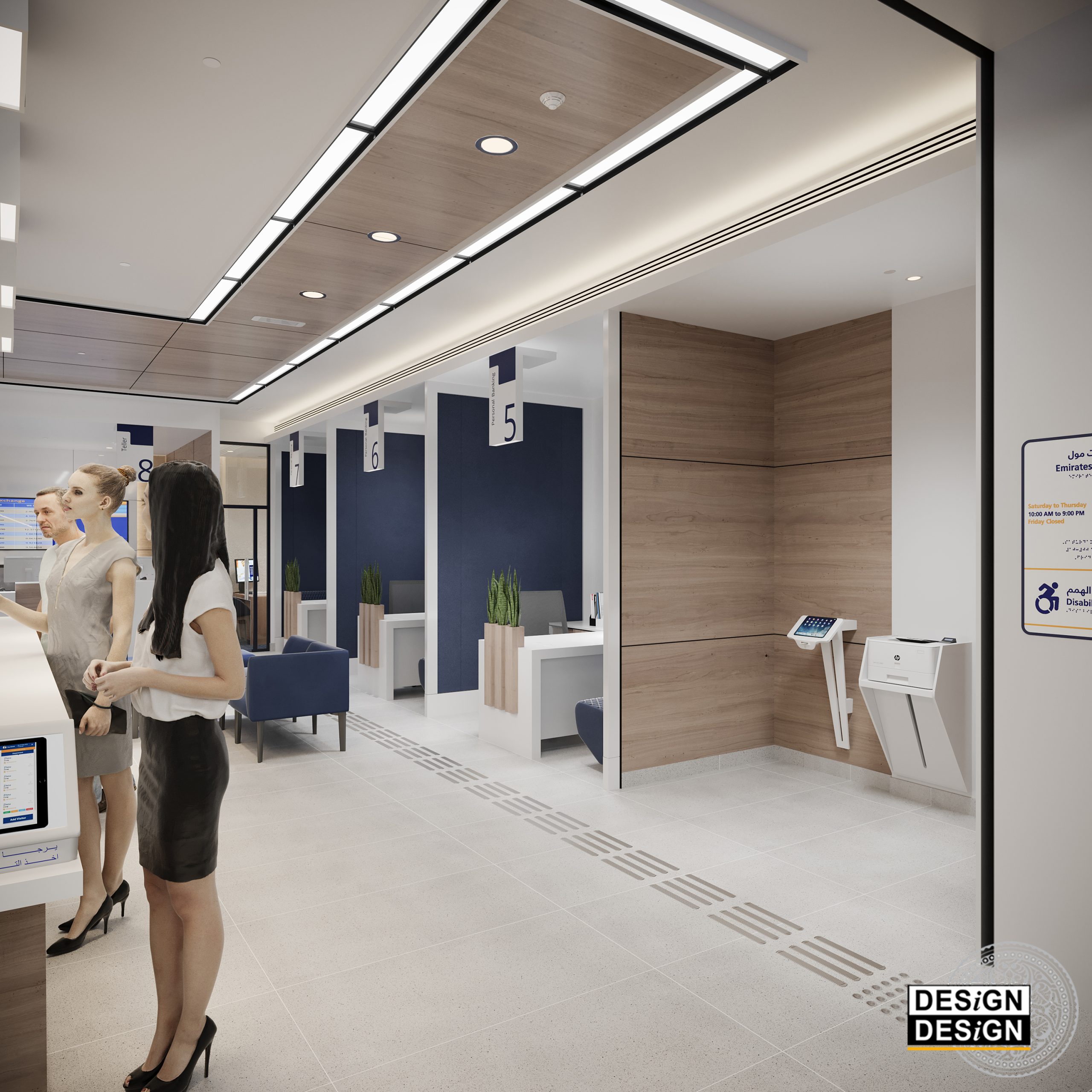 The project consists of developing the design concept of Emirates NBD typical retail branch. For this purpose, an eventful branch, located in the Mall of the Emirates in Dubai, was selected to serve as a prototype. The branch features modular work-cells carefully designed to accommodate specific operations. The general mood is minimal, cheerful and dynamic keeping an open circulation and easy access to branch visitors. The finishing materials are selected from sustainable recourses casting an authentic modern look to the branch interior. The prototype Emirates NBD retail branch is the first of its kind in the GCC and the second bank worldwide to successfully achieve the Platinum LEED certification.