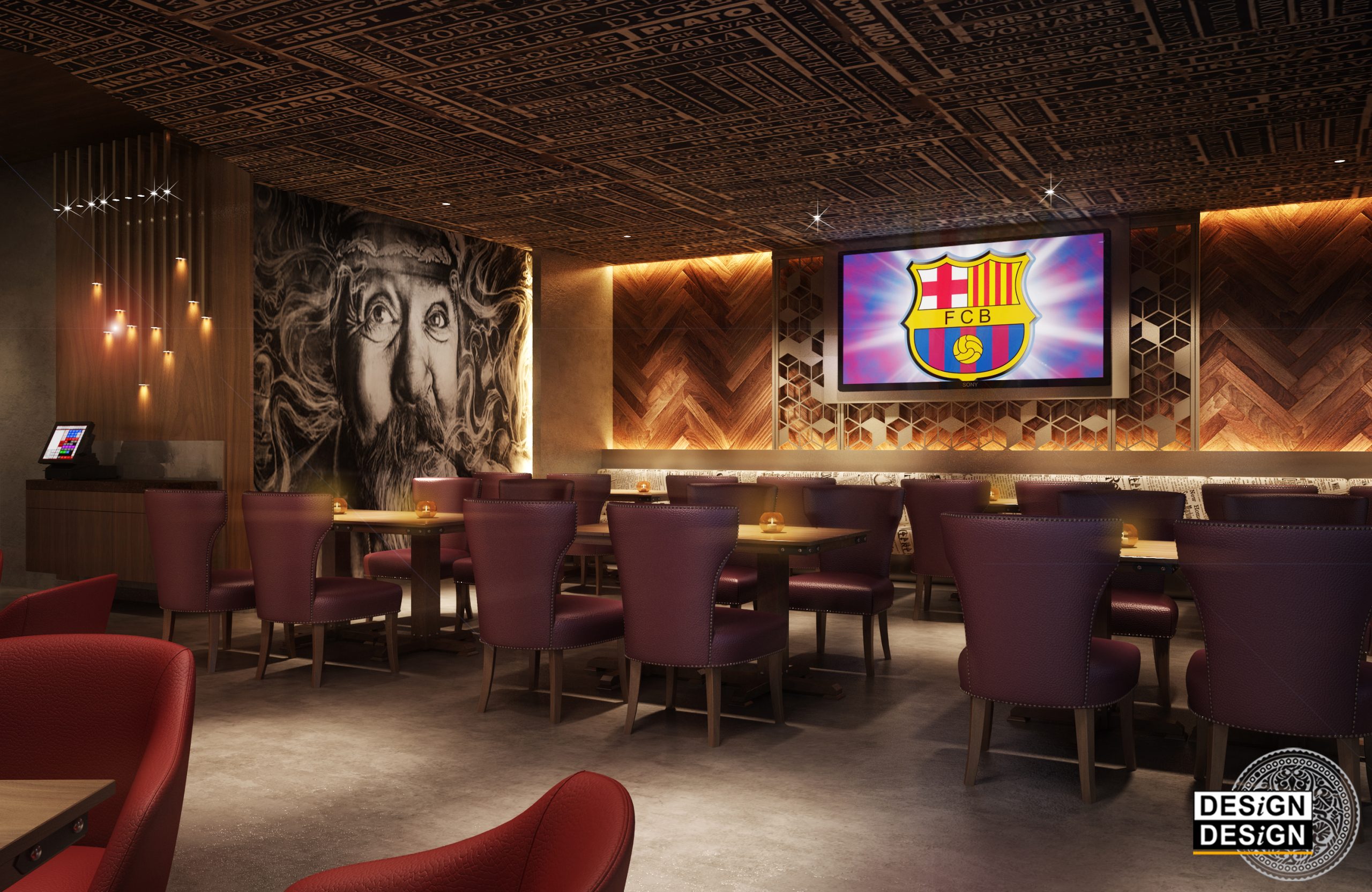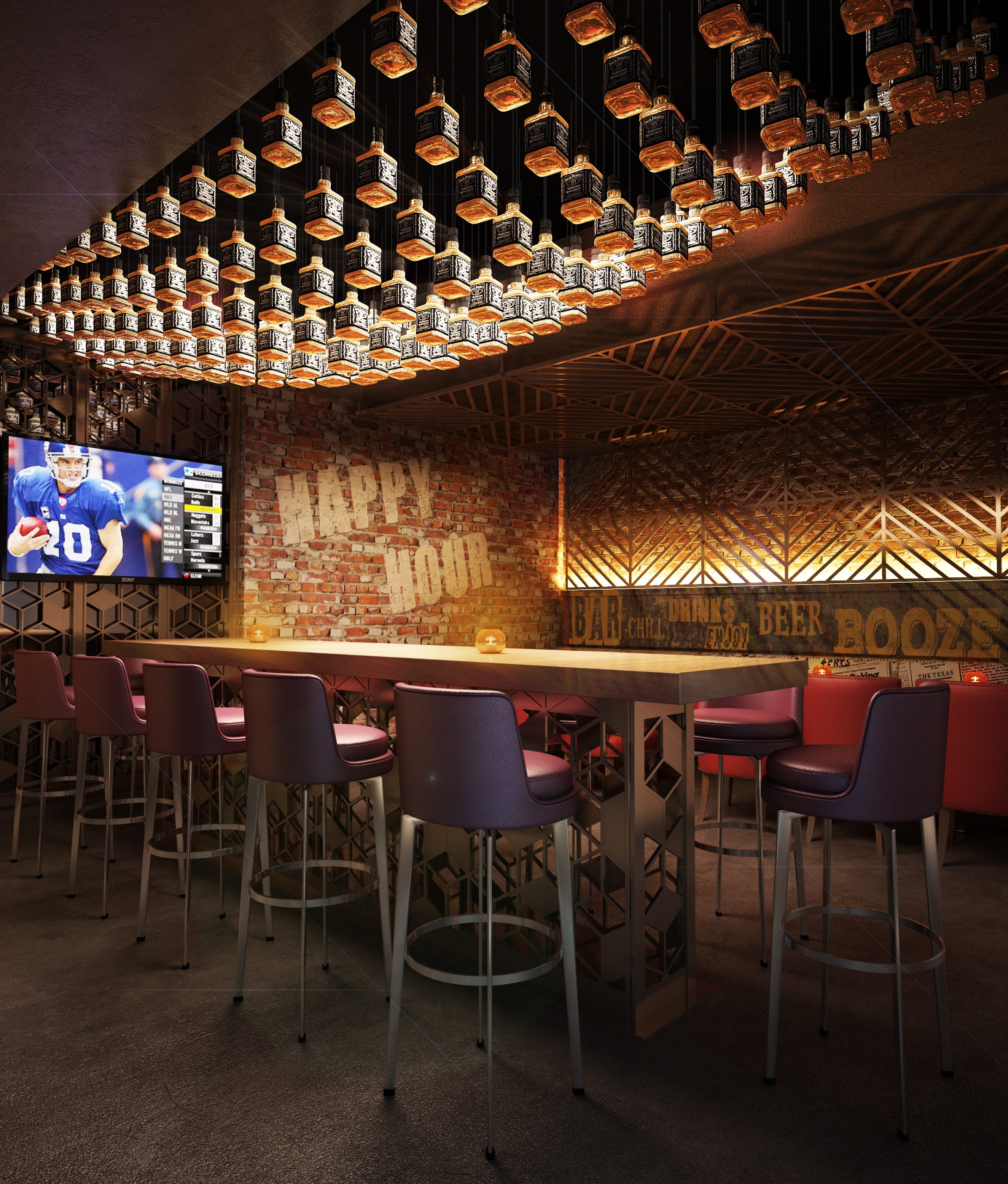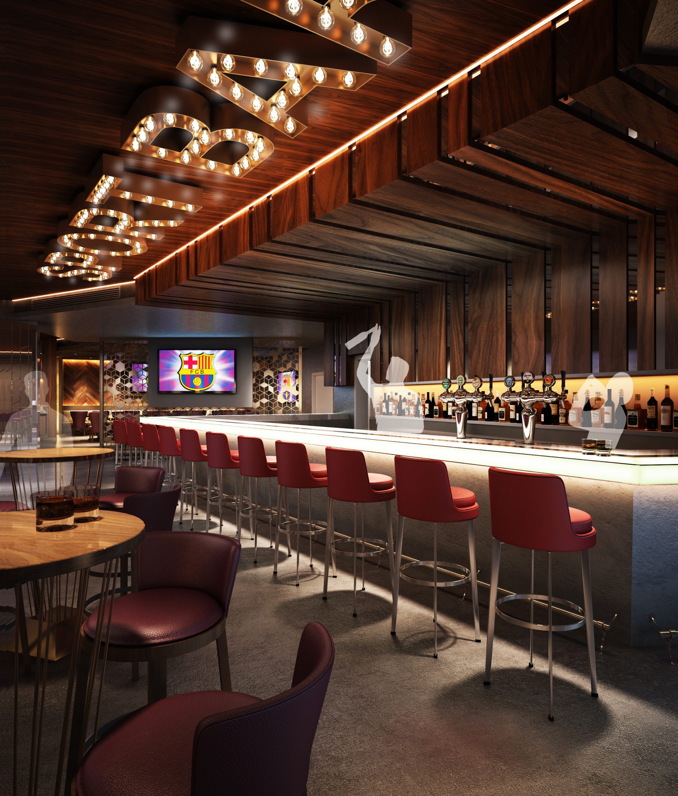The design proposal features an urban design with a hint of modern technology. The pub is heavily visited by fans pursuing global sports events as well as by business guests who are seeking a day-end sanctuary with an energetic mood