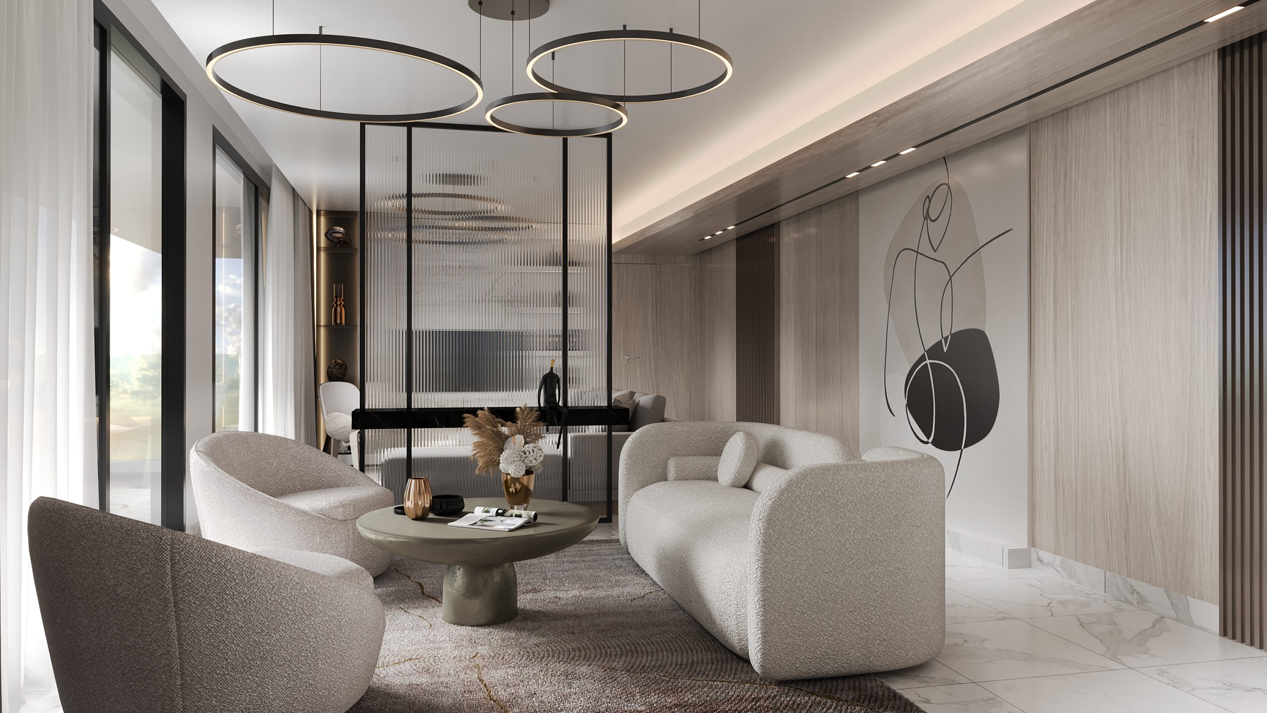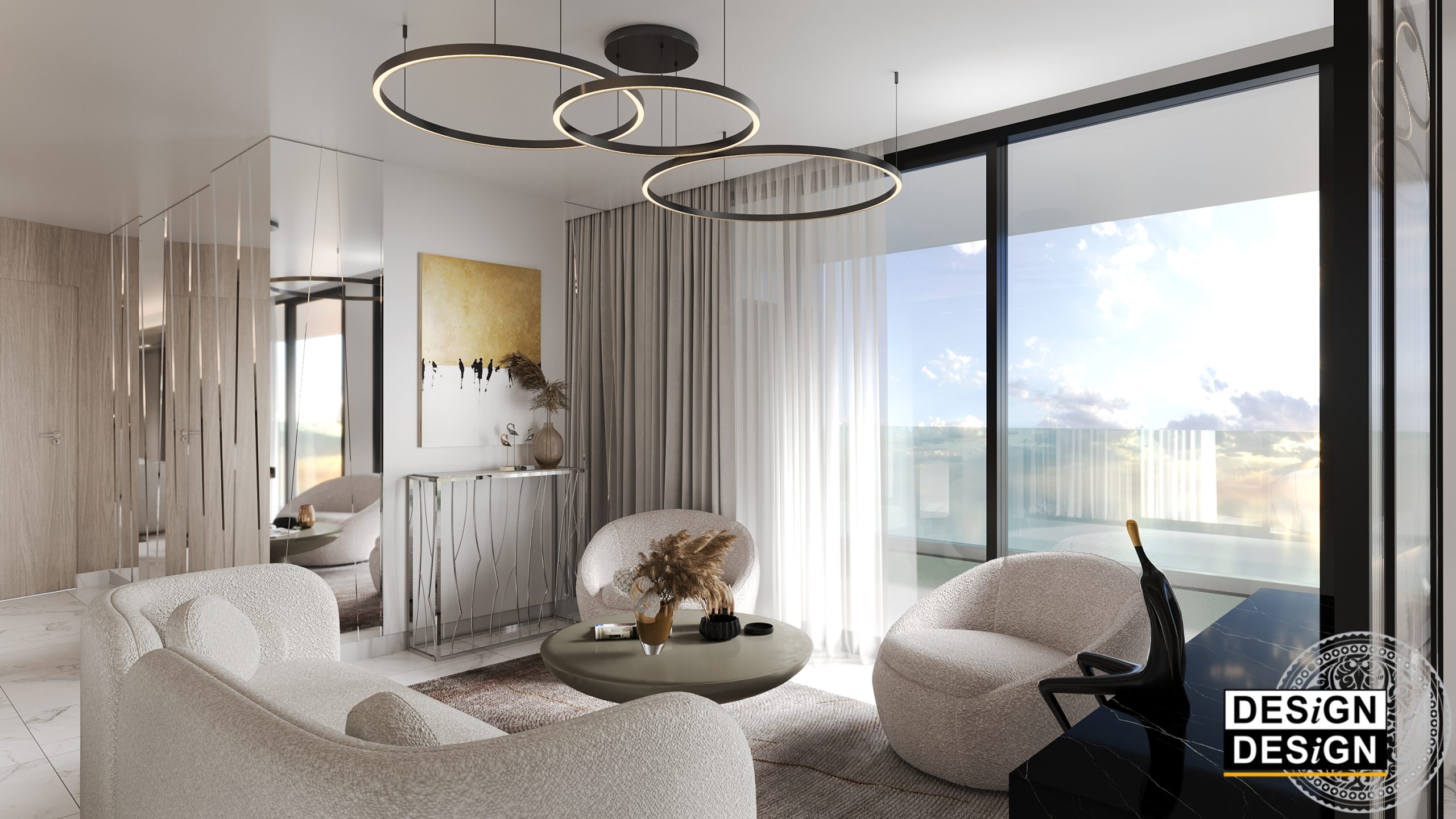 The apartment is located in a remarkable area overlooking the French Riviera from one side and the Italian border from the other. The design solution was carefully developed to maximize the use of space yet keeping the interior vast, chic and functional. Unusual components were devised such as a hidden kitchen and doors in addition to a fully automated gazebo on the roof.