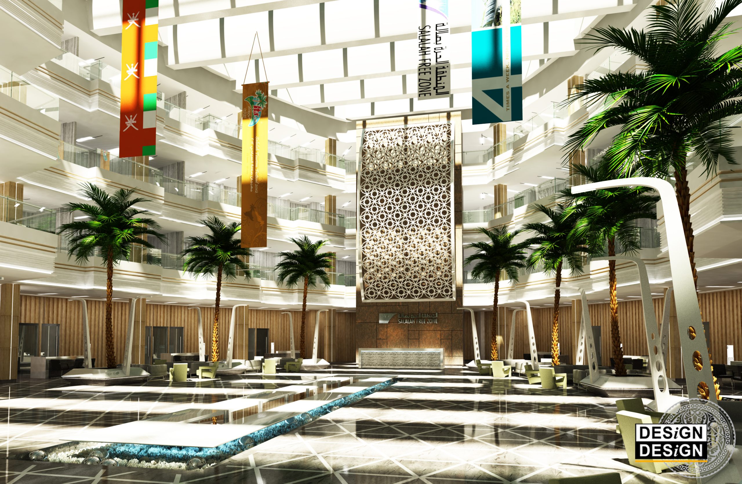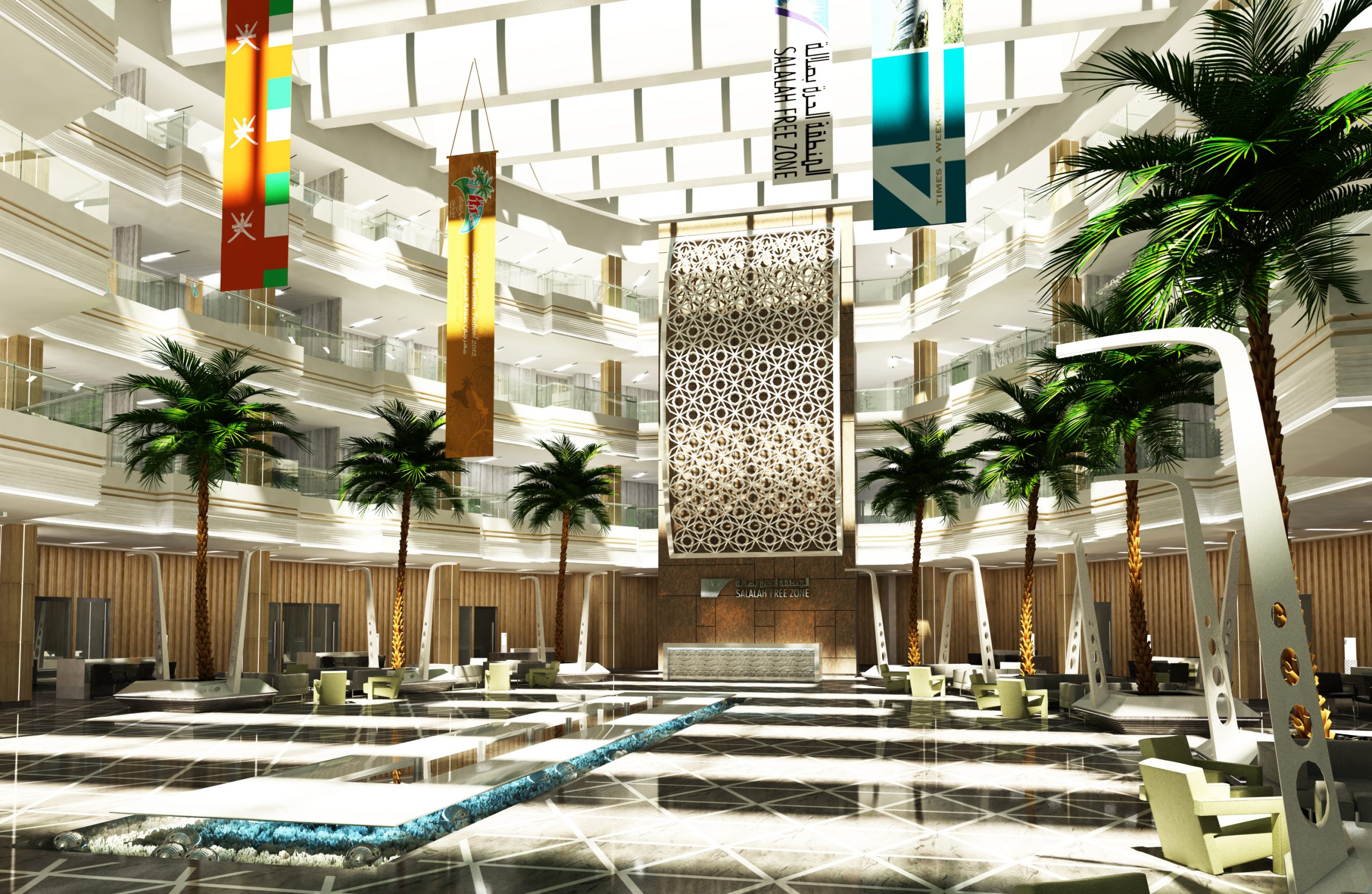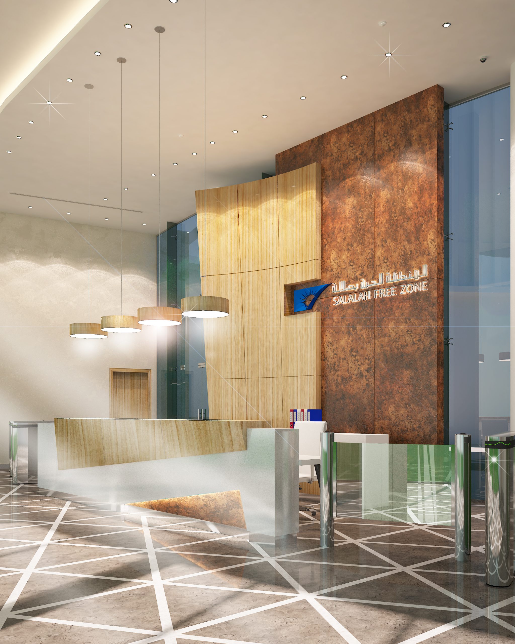 The proposed design reflects the heritage of the Sultanate of Oman, the synergy of the gulf, and the speed of the rapid modern evolution. The heritage is depicted in the use of raw materials and traditional Omani patterns. Vertical cladding on the walls reflects the strength and re-ability of the operation. Intersecting floor pattern suggests the concept of networking. The overall aspect of the proposed design suggests: “A promising growth which is generated by an equal opportunity network, brought together on solid ground.”